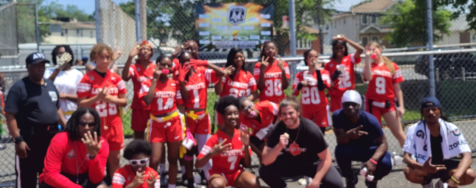 Lafayette High School in Brooklyn, NY, shows off the Championship glory in the 2025 American Youth Officials First Annual Girls Flag Football showcase at Springfield Gardens High School in Jamaica, New York on Sunday, June 8th, 2025.